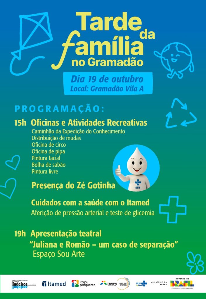 A Tarde da Família no Gramadão é uma iniciativa que marca a celebração do aniversário de 38 anos do Ecomuseu de Itaipu e os 35 anos do Sistema Único de Saúde (SUS), com a presença especial do personagem Zé Gotinha, símbolo das campanhas de vacinação no Brasil. O evento é gratuito e aberto à comunidade.