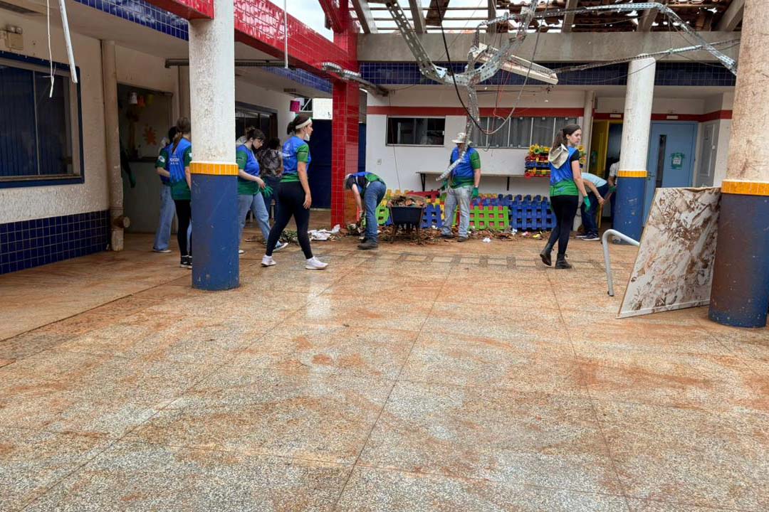 Entre as diversas frentes de apoio, uma das primeiras ações desenvolvidas pelos acadêmicos foi o trabalho de limpeza do Centro de Educação Infantil Dona Laura para voltar a receber alunos de 0 a 10 anos. Esses alunos são extensionistas do Projeto Rondon, acostumados a atuar junto à comunidade para trocar experiências e com facilidade para ajudar com organização.
