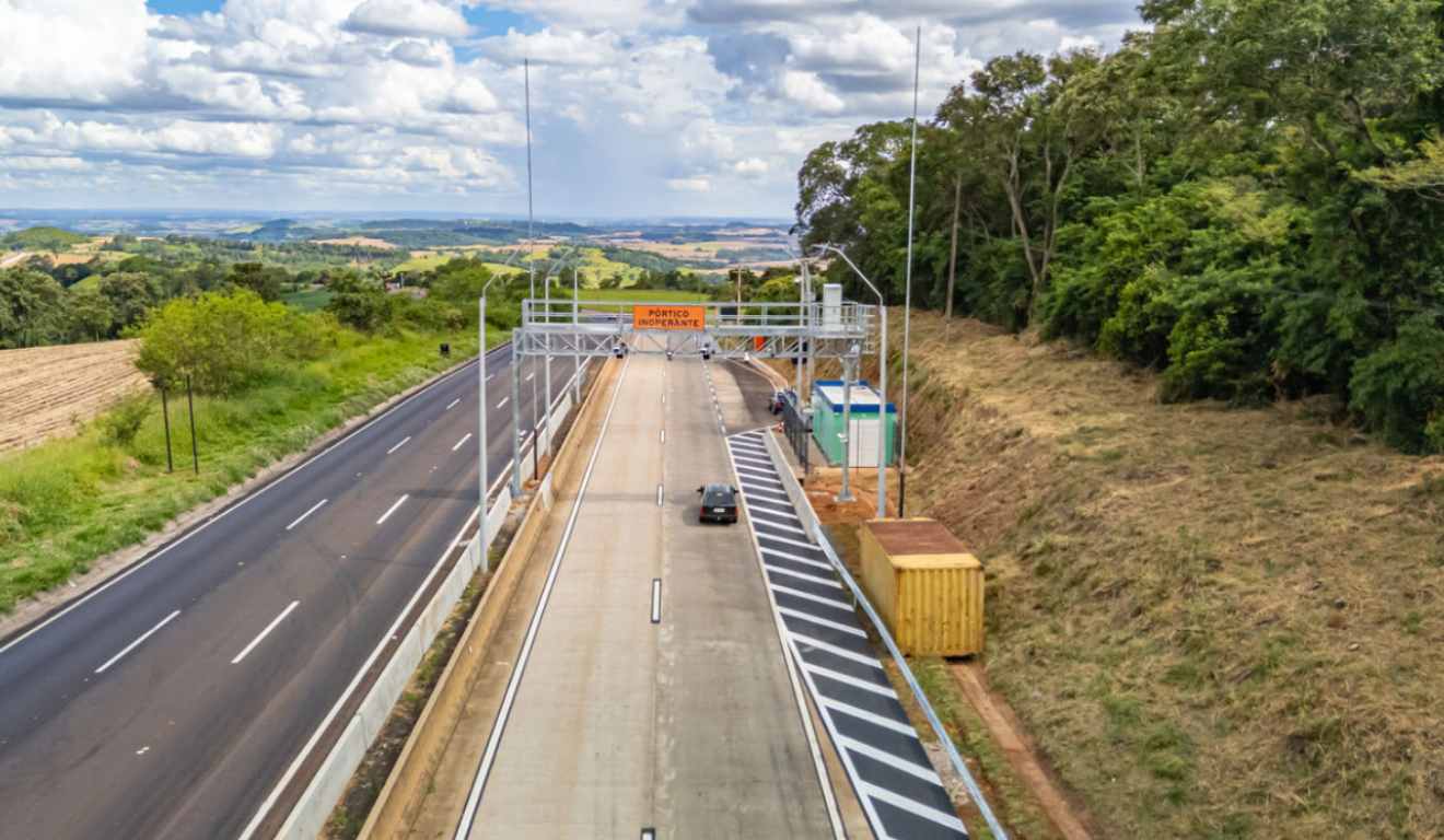 O pedágio eletrônico opera por meio de pórticos equipados com sensores capazes de identificar 100% das passagens. O sistema reconhece tag ou placa do veículo e detecta características como altura, largura, comprimento e número de eixos, permitindo a cobrança automática com fluxo contínuo e dentro do limite de velocidade da via, sem necessidade de parada.