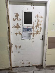 Os registros, feitos em setores em funcionamento, especialmente em áreas de atendimento e circulação de pacientes, evidenciam problemas como dificuldade no fechamento de portas, desgastes visíveis e improvisações, além da presença de resíduos em locais de passagem. O cenário é incompatível com um ambiente hospitalar, que deve priorizar segurança, higiene e acolhimento.