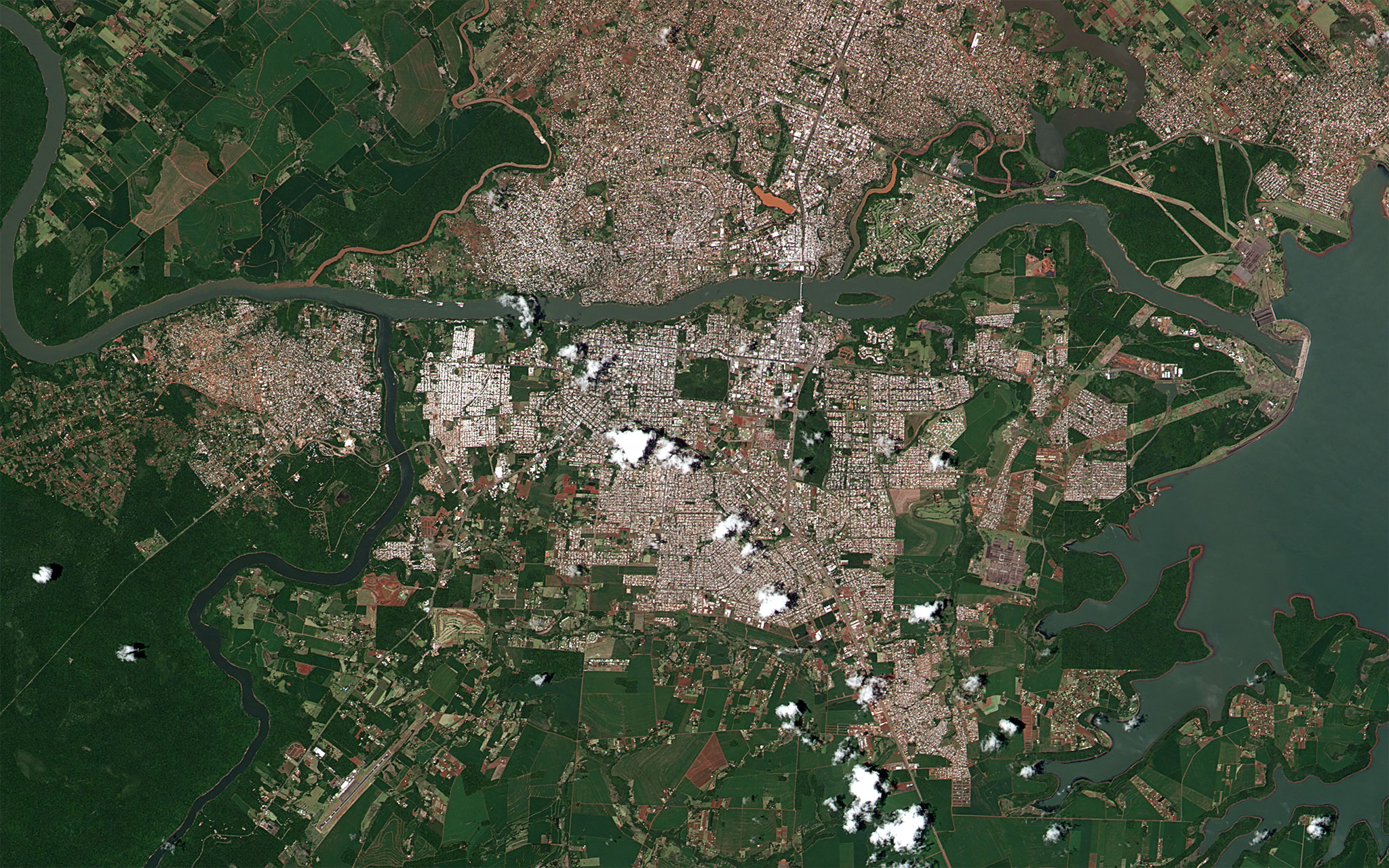 Imagem de satélite de Foz do Iguaçu. À esquerda e abaixo do rio Iguaçu, a cidade de Puerto Iguazu, na Argentina. Ao centro e abaixo do rio, a cidade de Foz do Iguaçu. Acima do rio, a Ciudad del Este. À direita, o reservatório de Itaipu.